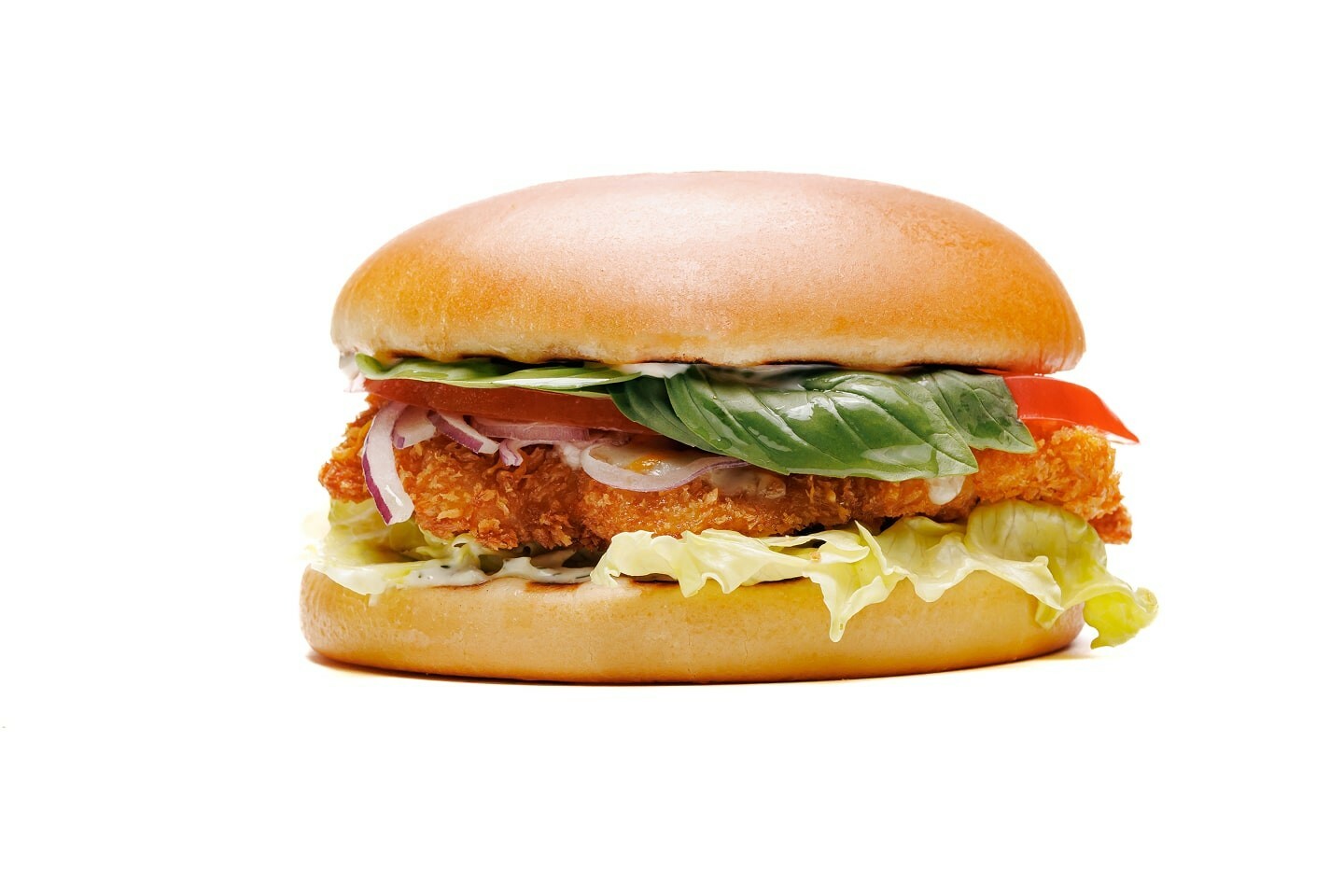 Булочка бриошь, соус блю чиз, соус тар-тар, куриное филе в панировке, салат айсберг, лук красный, свежий базилик, сыр чеддер, сыр моцарелла.