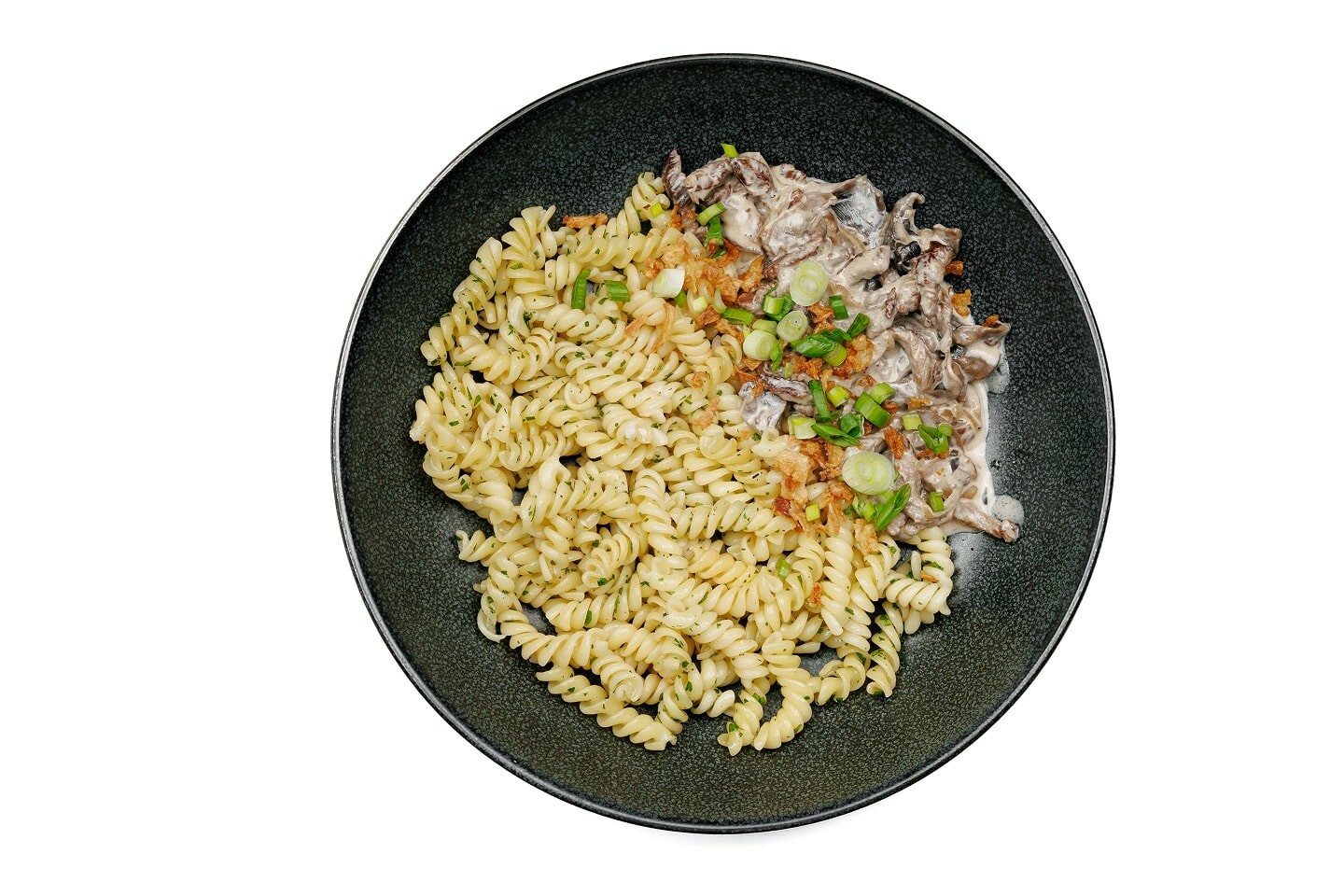 Говяжья вырезка, репчатый лук, грибы шампиньоны, сливки 22%, куриный бульон, соль, перец черный молотый, лук фри, лук зеленый, паста джирандоле, сливочное масло, зелень (укроп\петрушка).
