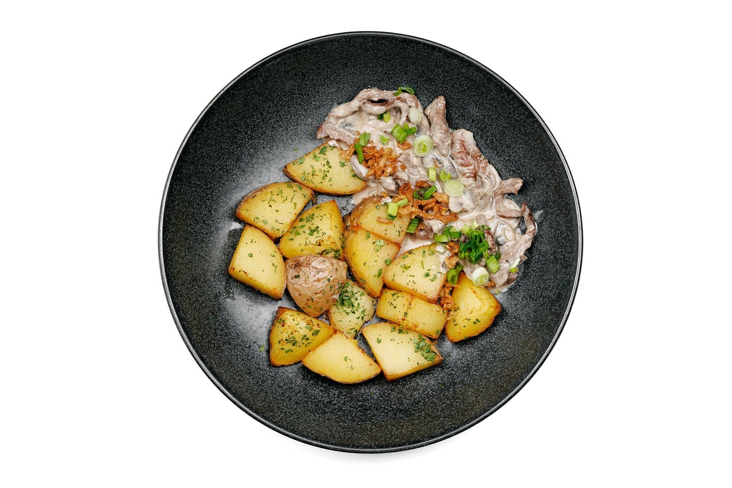 Говяжья вырезка, репчатый лук, грибы шампиньоны, сливки 22%, куриный бульон, соль, перец черный молотый, лук фри, лук зеленый, жареный картофель, сливочное масло, зелень (укроп\петрушка).