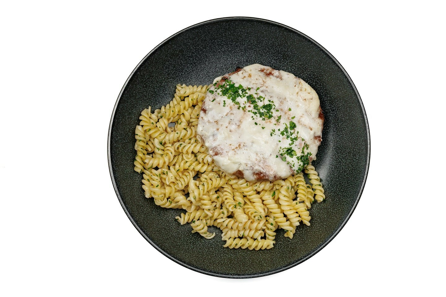 Бифштекс из мяса свинины и говядины, смесь специи, куриный бульон, сыр моцарелла, сливочный соус, паста отварная джирандоле, зелень (укроп / петрушка).