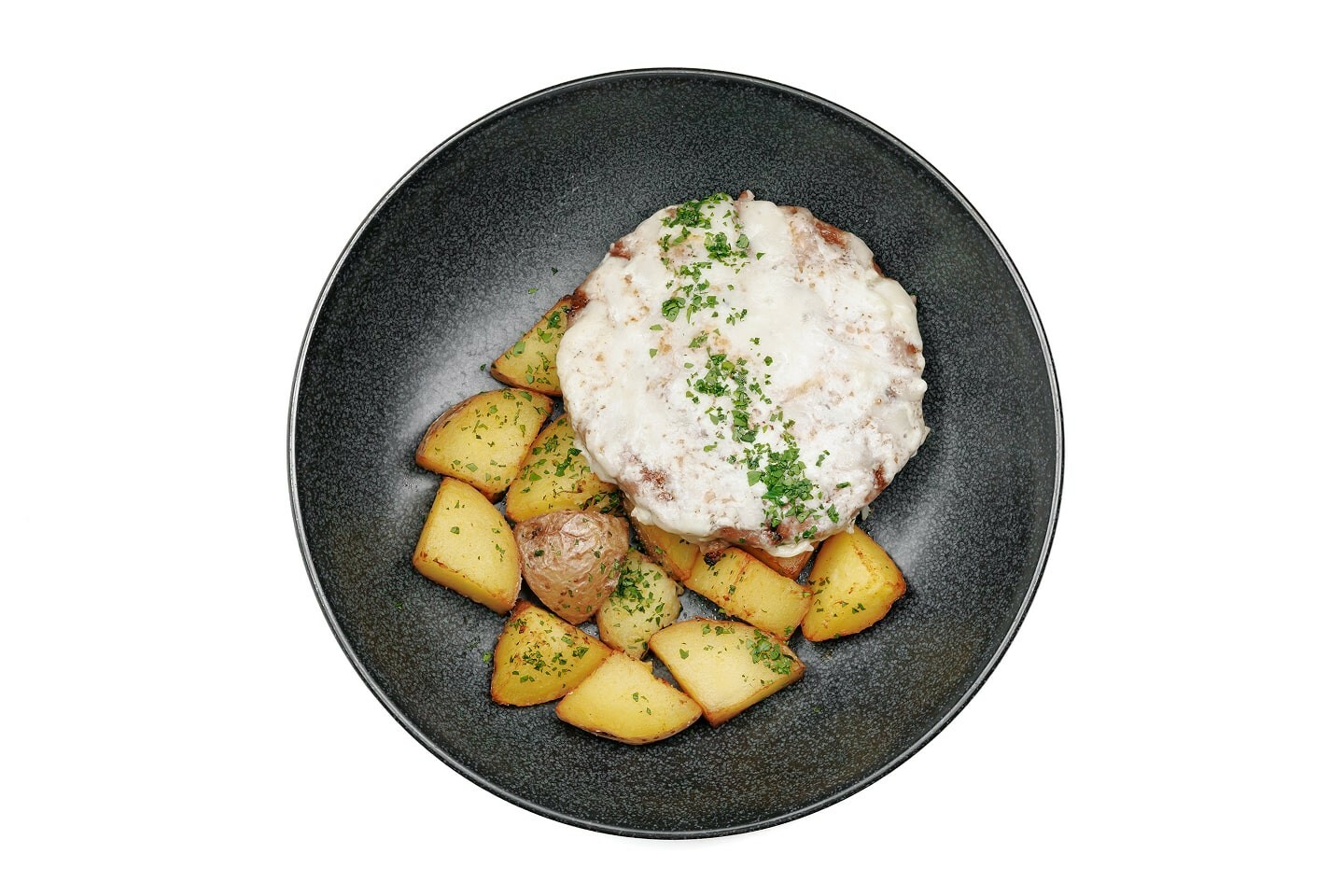 Бифштекс из мяса свинины и говядины, смесь специи, куриный бульон, сыр моцарелла, сливочный соус, картофель жаренный, зелень (укроп\петрушка).