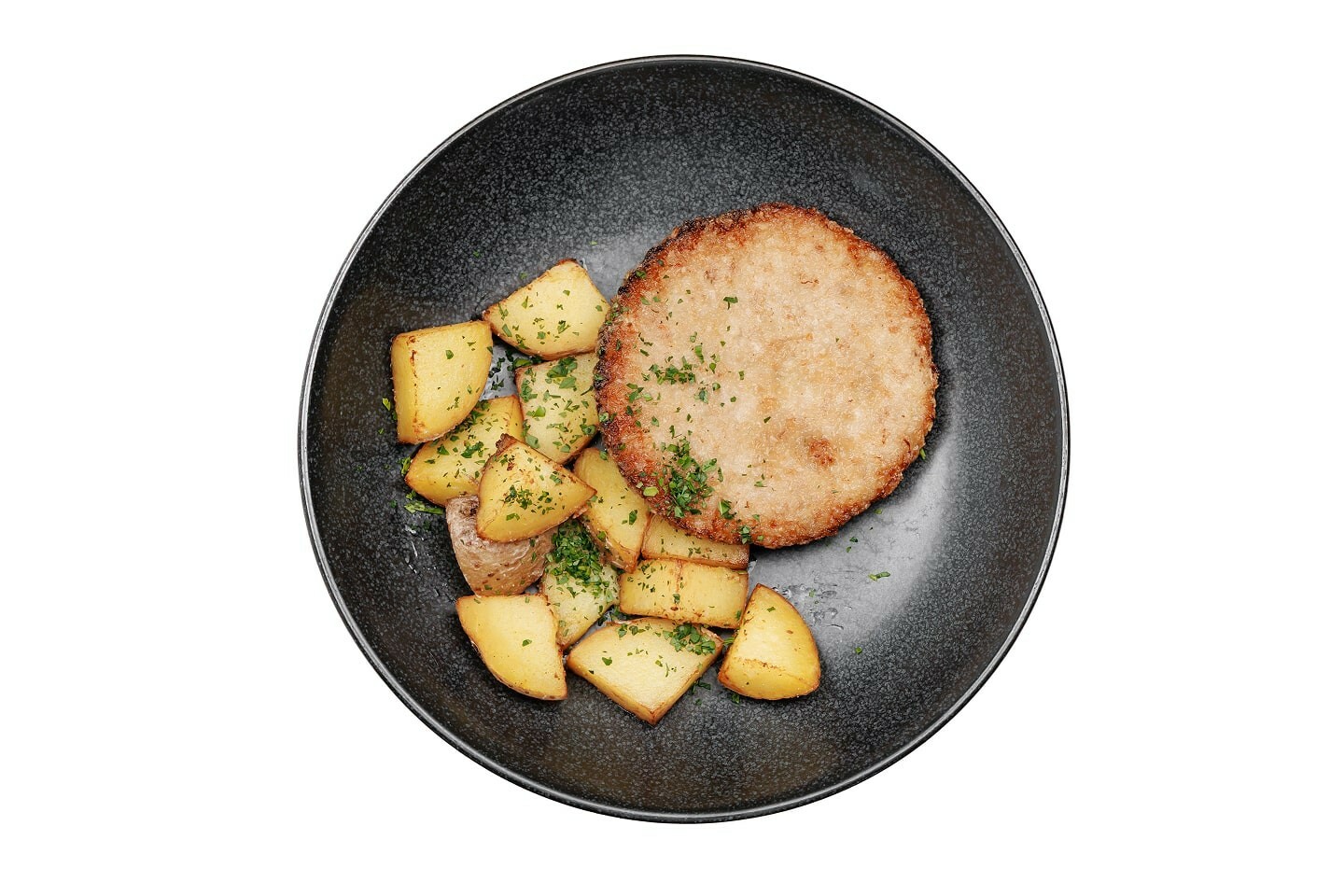 Фарш из куриного бедра, сливочное масло, соль, перец черный молотый, сухари панко, жареный картофель, зелень (укроп/петрушка).