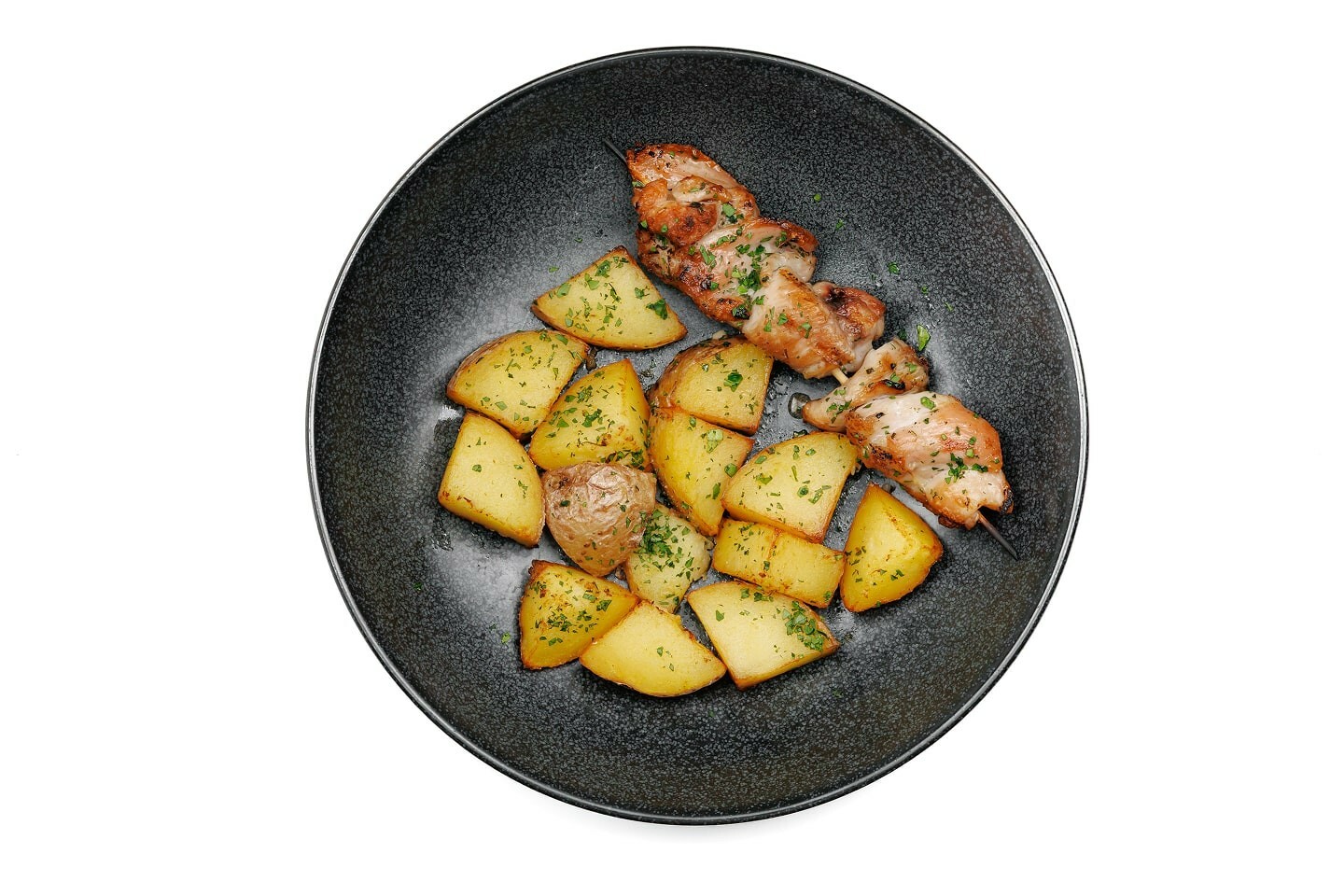 Куриный шашлык маринованный в сливочном масле с зеленью и лимонным соком, жаренный картофель, сливочное масло, зелень (укроп \ петрушка).