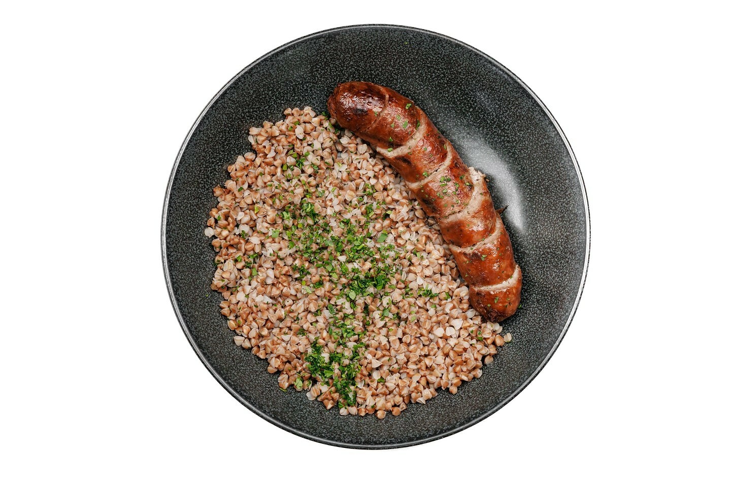 Колбаска из мяса свинины и говядины, куриное яйцо, лук репчатый, кукурузный крахмал, соль, перец черный молотый, куриный бульон, отварная гречка, масло сливочное,  зелень (укроп/петрушка).