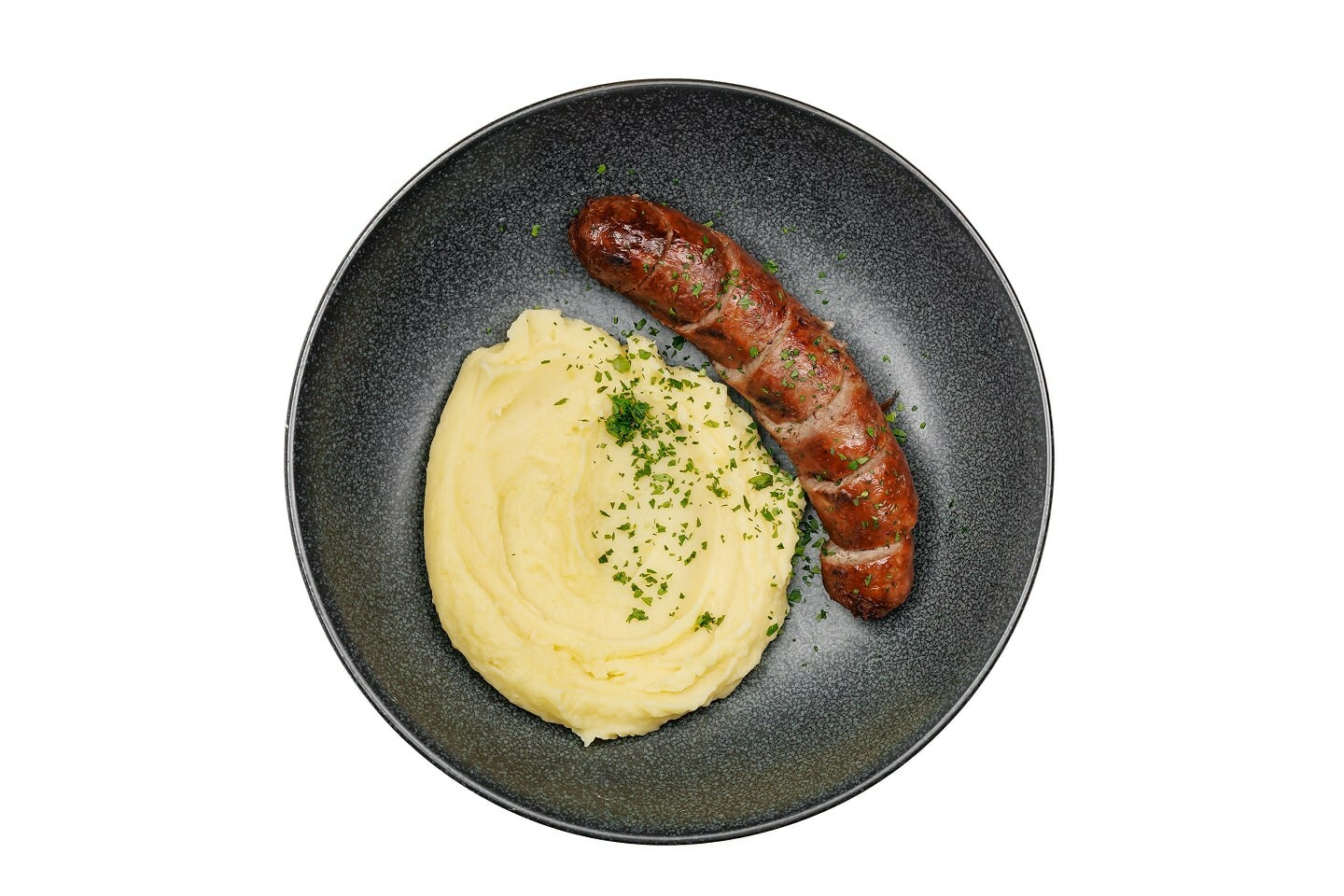 Колбаска из мяса свинины и говядины, куриное яйцо, лук репчатый, кукурузный крахмал, соль, перец черный молотый, картофельное пюре, масло сливочное, зелень (укроп/петрушка).