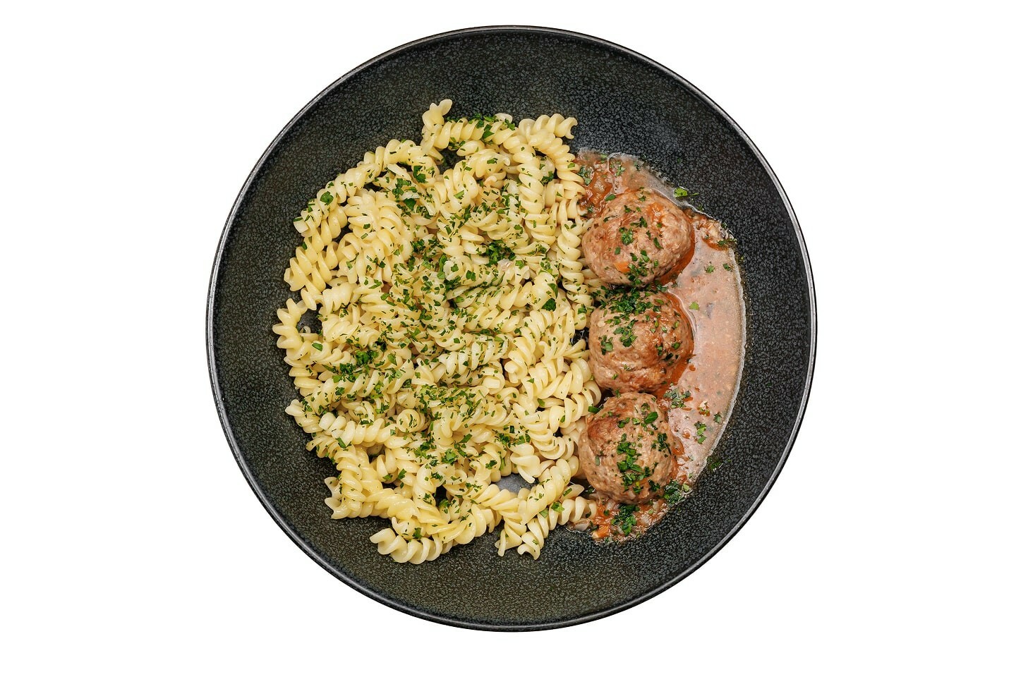 Тефтели из мяса свинины и говядины, сушеный орегано, белое вино, куриный бульон, томатный соус с базиликом, лук репчатый, морковь, стебель сельдерея, сливочное масло, зелень (укроп/петрушка), паста джирандоле.