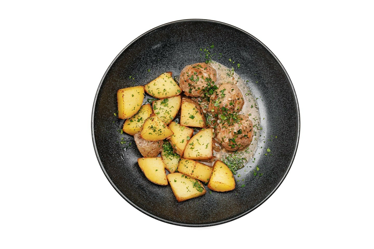 Тефтели из мяса свинины и говядины, сушеный орегано, белое вино,  куриный бульон, томатный соус с базиликом, лук репчатый, морковь, стебель сельдерея, сливочное масло, зелень (укроп/петрушка), жареный картофель.