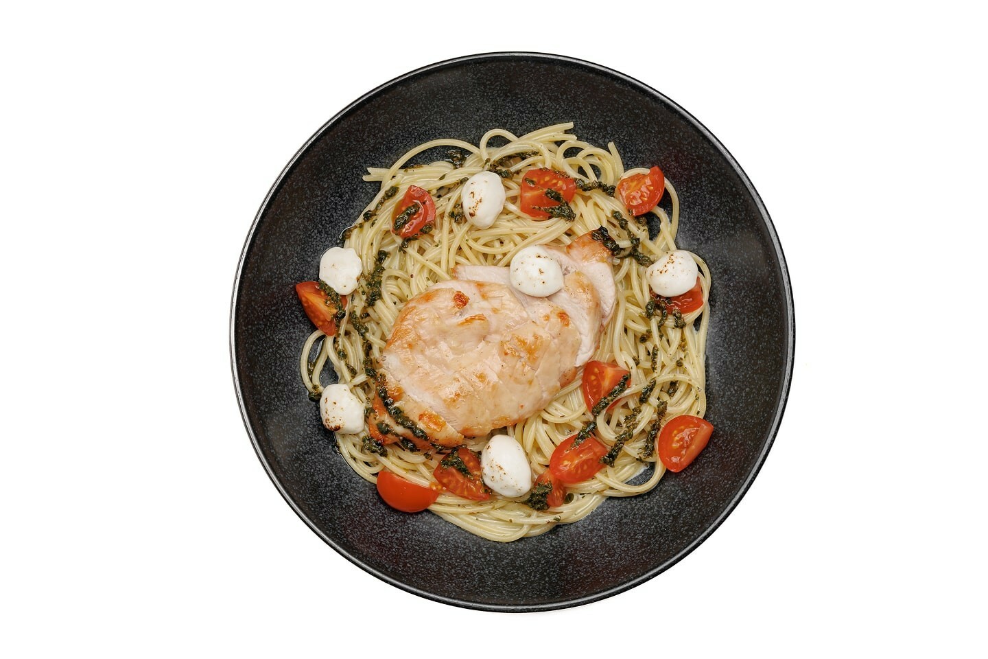 Паста феттучини, сливки 22%, куриный бульон, соус песто, куриное филе, свежие томаты, сыр моцарелла