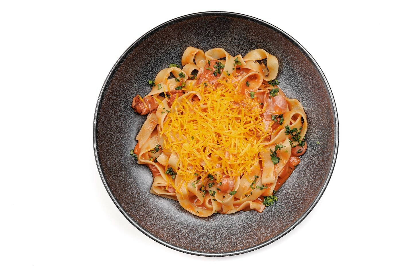 Паста феттучини, томатный соус с базиликом, бекон, охотничьи колбаски, ветчина, сливки 22%, сыр чеддер, куриный бульон
