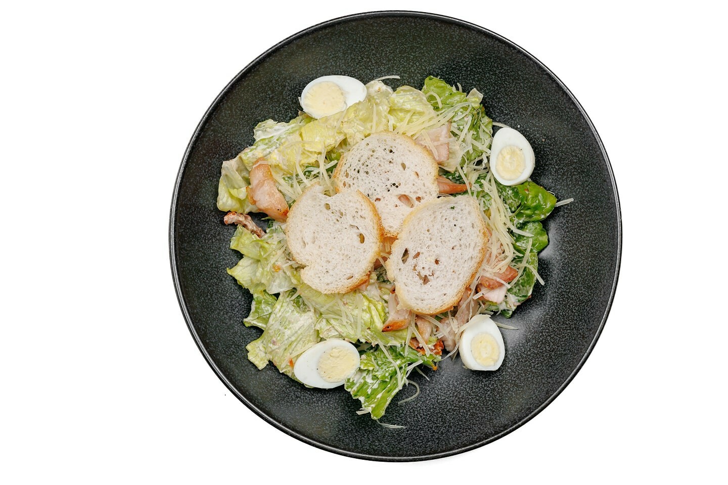 Филе куриной грудки, салат айсберг, томаты, пармезан, сухарики, соус «Цезарь».